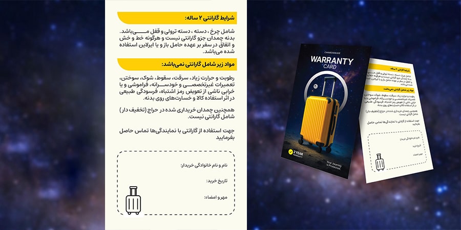 شامل چرخ ، دسته ، دسته ترولی و قفل می باشد ! بدنه چمدان جزو گارانتی نیست و هرگونه خط و خش و اتفاق در سفر بر عهده حامل باز و یا ایرلاین استفاده شده میباشد. مواد زیر شامل گارانتی نمیباشد : رطوبت و حرارت زیاد ، سرقت ، سقوط ، شوک ، سوختن ، تعمیرات غیرتخصصی و خود سرانه ، فراموشی و یا خرابی ناشی از تعویض رمز اشتباه ، فرسودگی طبیعی در اثر استفاده کالا و خسارتهای روی بدنه . همچنین چمدان خریداری شده در حراج ( تخفیف دار ) شامل گارانتی نیست . جهت استفاده از گارانتی با نمایندگی چمدانکده تماس حاصل بفرمایید.